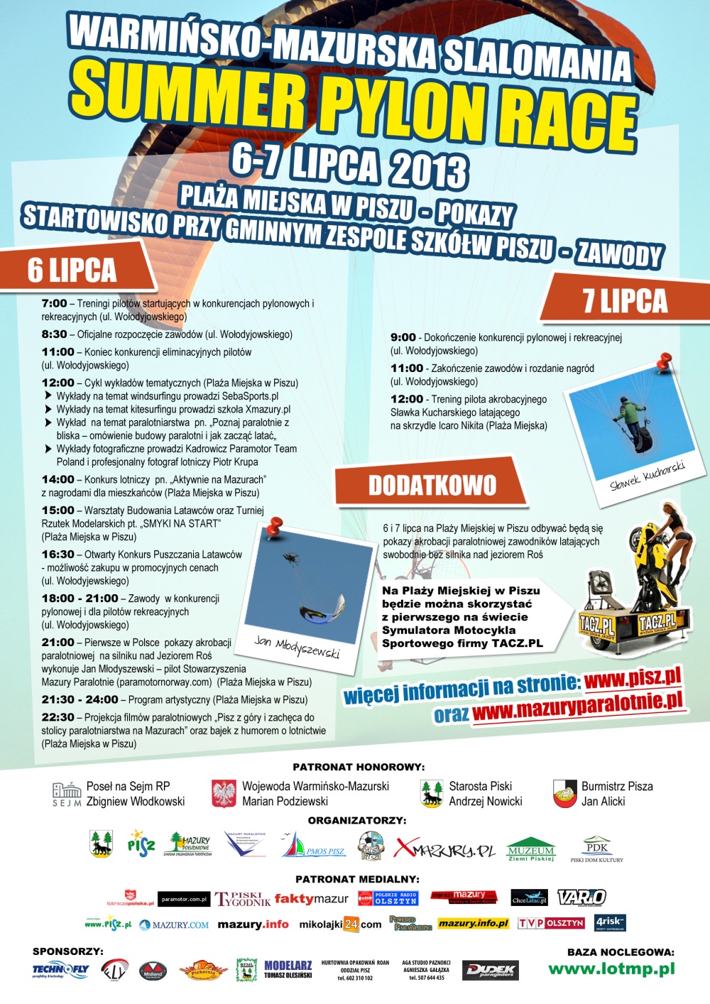 Po udanych Zimowych zawodach w Piszu, zapraszamy ponownie wszystkich pilotów i publiczność na letnią edycję zawodów oraz pokazów paralotniowych pod nazwą „Warmińsko-Mazurska Slalomania Summer Pylon Race Pisz 2013 w terminie 6-7 lipca w Piszu, na której piloci będą mogli sprawdzić swoje siły przed nadchodzącymi Mistrzostwami Polski. Startowisko dla paralotniarzy zostało przygotowane przy ulicy Wołodyjowskiego 17, a atrakcje dla publiczności na Plaży Miejskiej przy ulicy Aleja Turystów.